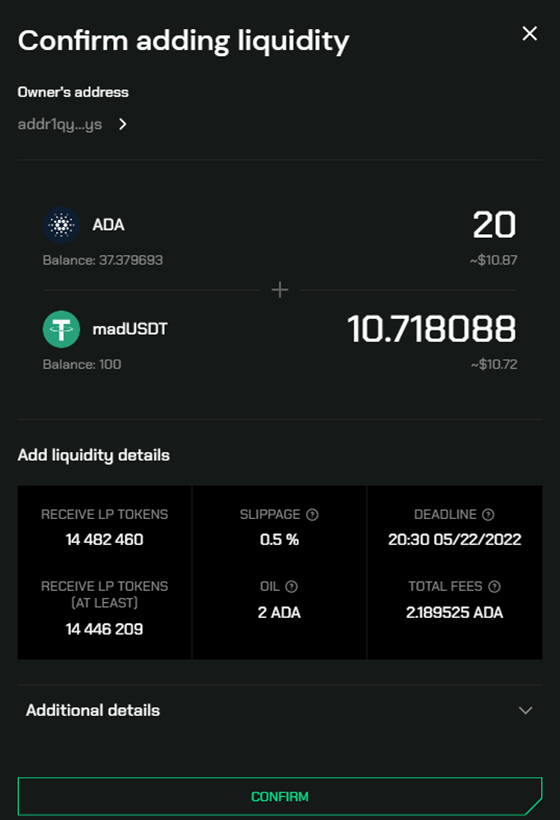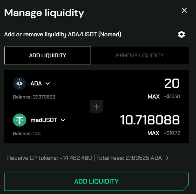 Connect to the app using your Flint wallet and go to the Pools. Find the ADA/madUSDT pool and press add liquidity. Select how much liquidity you wish to add, in this case 20ADA and the equivalent in madUSDT.