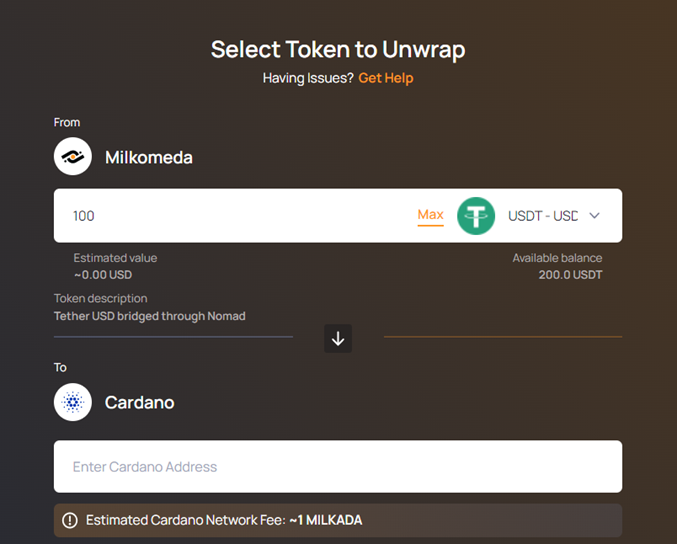 9. Select Milkomeda C1 as the network in Metamask and now you can bridge the USDT to the Cardano network. In the bridge interface select the token from Milkomeda as USDT (Nomad) and input the amount in this case; 100USDT.