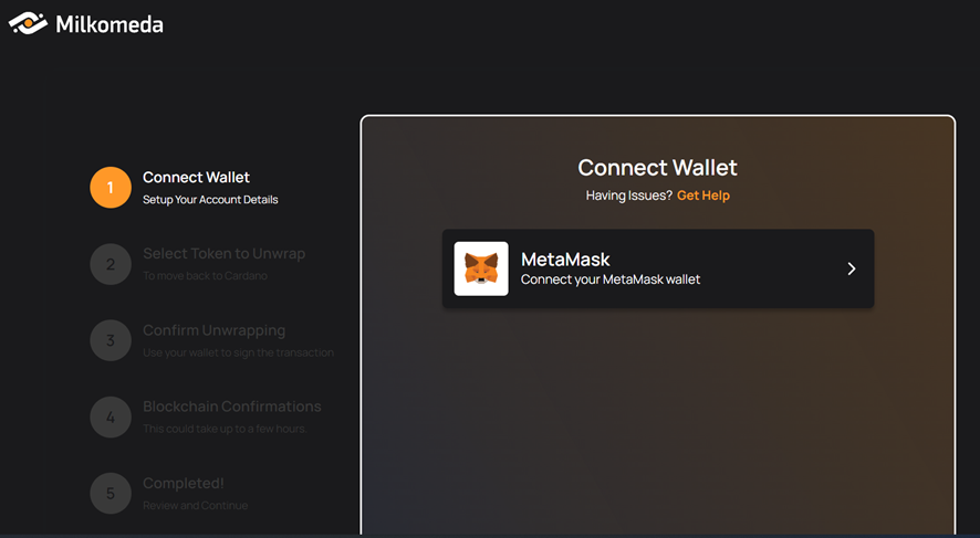 8. Let’s now send the madUSDT to our Cardano wallet using the Milkomeda bridge. Go to https://cardano-bridge.milkomeda.com/bridge and connect your Metamask wallet.