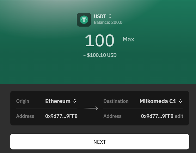 3. On the Nomad bridge UI you need to select the token you wish to bridge, which in this case is USDT (ERC20), input the amount you wish to transfer, in this case 100 USDT. Then select the origin, which will automatically have been selected as Ethereum and destination as Milkomeda C1.