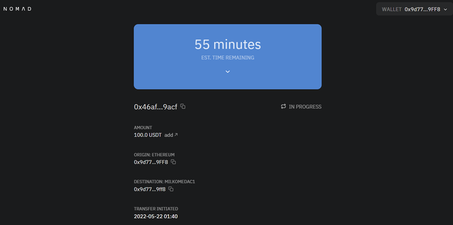5. Now you will see the screen below. This will change soon to a counter displaying a countdown to when the transaction will be completed and your assets bridged.