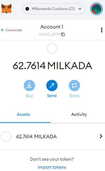 7. Make sure you are on the Milkomeda network in Metamask and press “Import tokens”.
