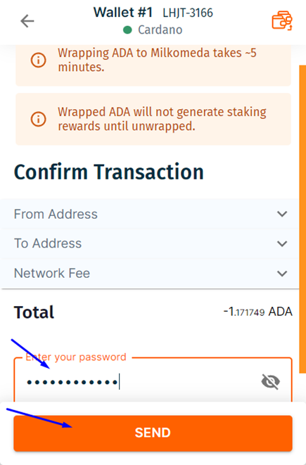 At the confirmation screen, enter your wallet password and click “Send”. At the confirmation screen, enter your wallet password and click “Send”.