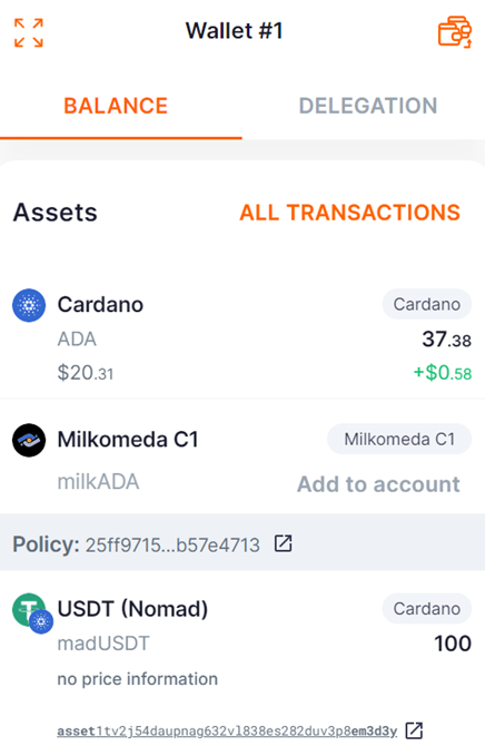 12. You will see the 100 madUSDT appear in your Flint wallet ready to be used on the WingRiders DEX.