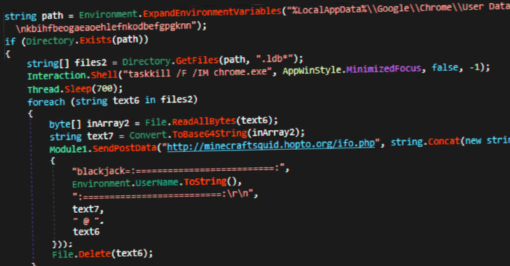 The attack sequence starts with the execution of an initial dropper, which proceeds to write heavily-encrypted interim binaries that are then used to launch the main component of the stealer — a .NET malware that incorporates different modules to facilitate its malicious activities, the results of which are exfiltrated to a remote server —